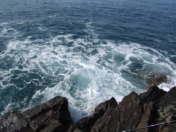 先端近くの沖へ出て行くサラシを攻めることにする。マキエを際にまき、ちょっと遠投する。
