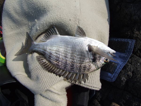 少ししてエサ取りが集まってきた。そのうち少し強い引きを感じた。上がってきたのは、小さなカイズ君だ。