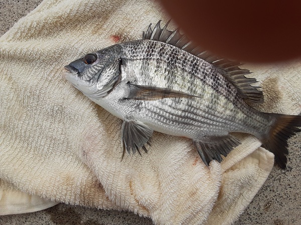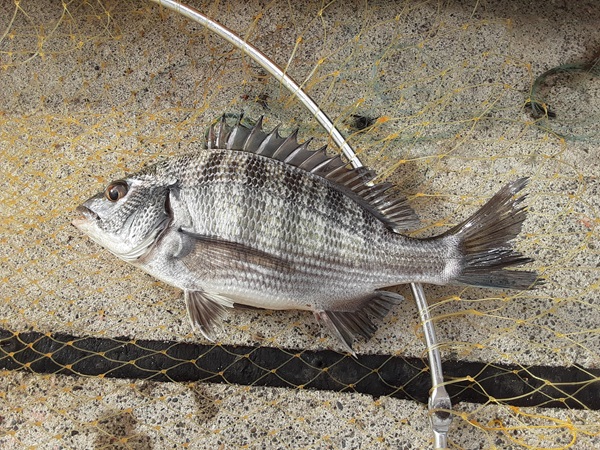 少し早いがさおを折る前に終了とする。結局2人の合計でカイズ1匹とチンチン5匹の釣果であった。